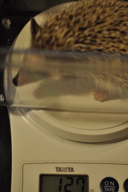 127g。2ヶ月の子にしてはだいぶ軽い気がします。たくさん食べて育って欲しいものです。