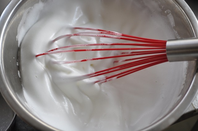 卵白はあわ立て、砂糖を加えてしっかりあわ立てる。