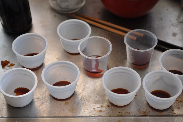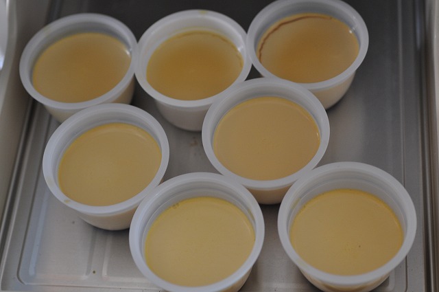 茶漉しでこして容器に注ぎ、お湯を張った鍋に並べてふたを至極弱火にかけて火を通す。