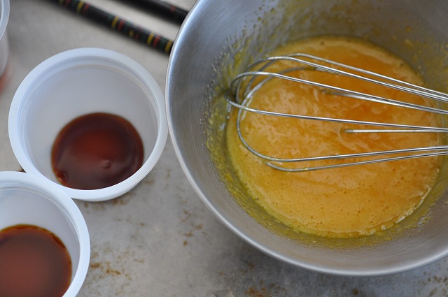 ふるった小麦粉を加えてさっくり混ぜ、油を加えてさらに混ぜる。