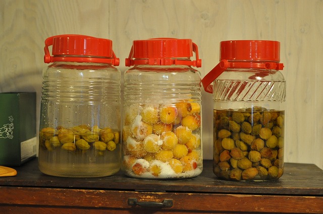 梅はこのように。梅干用の梅をもらってしまったので、梅シロップのビンを開けて、