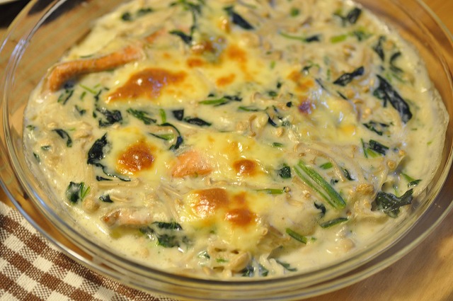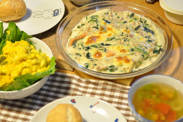 秋鮭とほうれん草のグラタン、トマトいりスープ、かぼちゃサラダ。