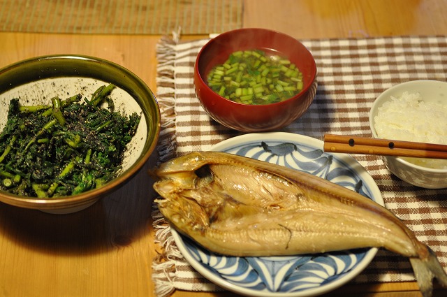 見切りになってたほっけ、春菊のごま汚し、大根の葉っぱの味噌汁…